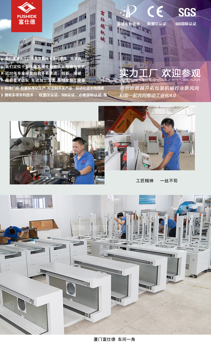 富仕德包裝機(jī)械公司坐落于廈門市,創(chuàng)建于一九九八年,是一家專業(yè)從事科研、設(shè)計(jì)、制造和銷售熱收縮機(jī),熱收縮包裝機(jī),熱收縮膜包裝機(jī),全自動(dòng)熱收縮包裝機(jī),全自動(dòng)熱收縮膜包裝機(jī)為一體的實(shí)業(yè)公司,生產(chǎn)多個(gè)系列的包裝機(jī)械產(chǎn)品:包括熱收縮機(jī),全自動(dòng)熱收縮包裝機(jī),熱收縮包裝機(jī),全自動(dòng)熱收縮膜包裝機(jī),熱收縮膜機(jī),熱收縮膜,收縮膜包裝機(jī),熱收縮膜機(jī),食品包裝機(jī),茶葉包裝機(jī),多功能包裝機(jī),全自動(dòng)包裝機(jī),開箱機(jī),封箱機(jī),包裝材料,POF熱收縮膜等,客戶遍布全國各地和海外地區(qū),其中福建本地客戶主要集中在廈門、泉州、漳州、福州、莆田等,公司定位于設(shè)計(jì)制造中高端的全自動(dòng)熱收縮膜包裝機(jī)械:包括食品包裝機(jī)、陶瓷包裝機(jī)、茶葉包裝機(jī)、壁紙包裝機(jī)、濾芯包裝機(jī)、飲料包裝機(jī)、衛(wèi)浴包裝機(jī)、日化產(chǎn)品包裝機(jī)、電子包裝機(jī)、五金包裝機(jī)、橡膠制品包裝機(jī)、墻紙包裝機(jī)、膠帶包裝機(jī)、化妝品包裝機(jī)、保健品包裝機(jī)、印刷品包裝機(jī)、彩盒包裝機(jī)、圓柱體包裝機(jī)、餐具包裝機(jī)、家居用品包裝機(jī)、瑜伽墊包裝機(jī)等適應(yīng)各行業(yè)不同形狀、單件、組合包裝產(chǎn)品;用于各行業(yè)產(chǎn)品的批量化包裝生產(chǎn);技術(shù)領(lǐng)先、制造精良,結(jié)實(shí)耐用; 我們具備廠家:從研發(fā)、生產(chǎn)、銷售、售后,以及穩(wěn)定的質(zhì)量和可控合理的價(jià)格等優(yōu)勢(shì);公司擁有多項(xiàng)國家專利技術(shù)并通過歐盟CE認(rèn)證,產(chǎn)品采用進(jìn)口知名品牌核心部件等,經(jīng)過近20年專業(yè)研發(fā)、設(shè)計(jì)經(jīng)驗(yàn)使得富仕德包裝機(jī)械產(chǎn)品更加卓越、穩(wěn)定、效率更高,更節(jié)約包材成本。