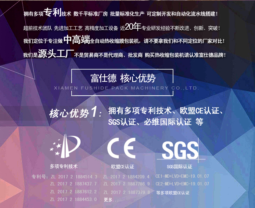 富仕德包裝機(jī)械公司坐落于廈門市,創(chuàng)建于一九九八年,是一家專業(yè)從事科研、設(shè)計(jì)、制造和銷售熱收縮機(jī),熱收縮包裝機(jī),熱收縮膜包裝機(jī),全自動(dòng)熱收縮包裝機(jī),全自動(dòng)熱收縮膜包裝機(jī)為一體的實(shí)業(yè)公司,生產(chǎn)多個(gè)系列的包裝機(jī)械產(chǎn)品:包括熱收縮機(jī),全自動(dòng)熱收縮包裝機(jī),熱收縮包裝機(jī),全自動(dòng)熱收縮膜包裝機(jī),熱收縮膜機(jī),熱收縮膜,收縮膜包裝機(jī),熱收縮膜機(jī),食品包裝機(jī),茶葉包裝機(jī),多功能包裝機(jī),全自動(dòng)包裝機(jī),開箱機(jī),封箱機(jī),包裝材料,POF熱收縮膜等,客戶遍布全國各地和海外地區(qū),其中福建本地客戶主要集中在廈門、泉州、漳州、福州、莆田等,公司定位于設(shè)計(jì)制造中高端的全自動(dòng)熱收縮膜包裝機(jī)械:包括食品包裝機(jī)、陶瓷包裝機(jī)、茶葉包裝機(jī)、壁紙包裝機(jī)、濾芯包裝機(jī)、飲料包裝機(jī)、衛(wèi)浴包裝機(jī)、日化產(chǎn)品包裝機(jī)、電子包裝機(jī)、五金包裝機(jī)、橡膠制品包裝機(jī)、墻紙包裝機(jī)、膠帶包裝機(jī)、化妝品包裝機(jī)、保健品包裝機(jī)、印刷品包裝機(jī)、彩盒包裝機(jī)、圓柱體包裝機(jī)、餐具包裝機(jī)、家居用品包裝機(jī)、瑜伽墊包裝機(jī)等適應(yīng)各行業(yè)不同形狀、單件、組合包裝產(chǎn)品;用于各行業(yè)產(chǎn)品的批量化包裝生產(chǎn);技術(shù)領(lǐng)先、制造精良,結(jié)實(shí)耐用; 我們具備廠家:從研發(fā)、生產(chǎn)、銷售、售后,以及穩(wěn)定的質(zhì)量和可控合理的價(jià)格等優(yōu)勢(shì);公司擁有多項(xiàng)國家專利技術(shù)并通過歐盟CE認(rèn)證,產(chǎn)品采用進(jìn)口知名品牌核心部件等,經(jīng)過近20年專業(yè)研發(fā)、設(shè)計(jì)經(jīng)驗(yàn)使得富仕德包裝機(jī)械產(chǎn)品更加卓越、穩(wěn)定、效率更高,更節(jié)約包材成本。